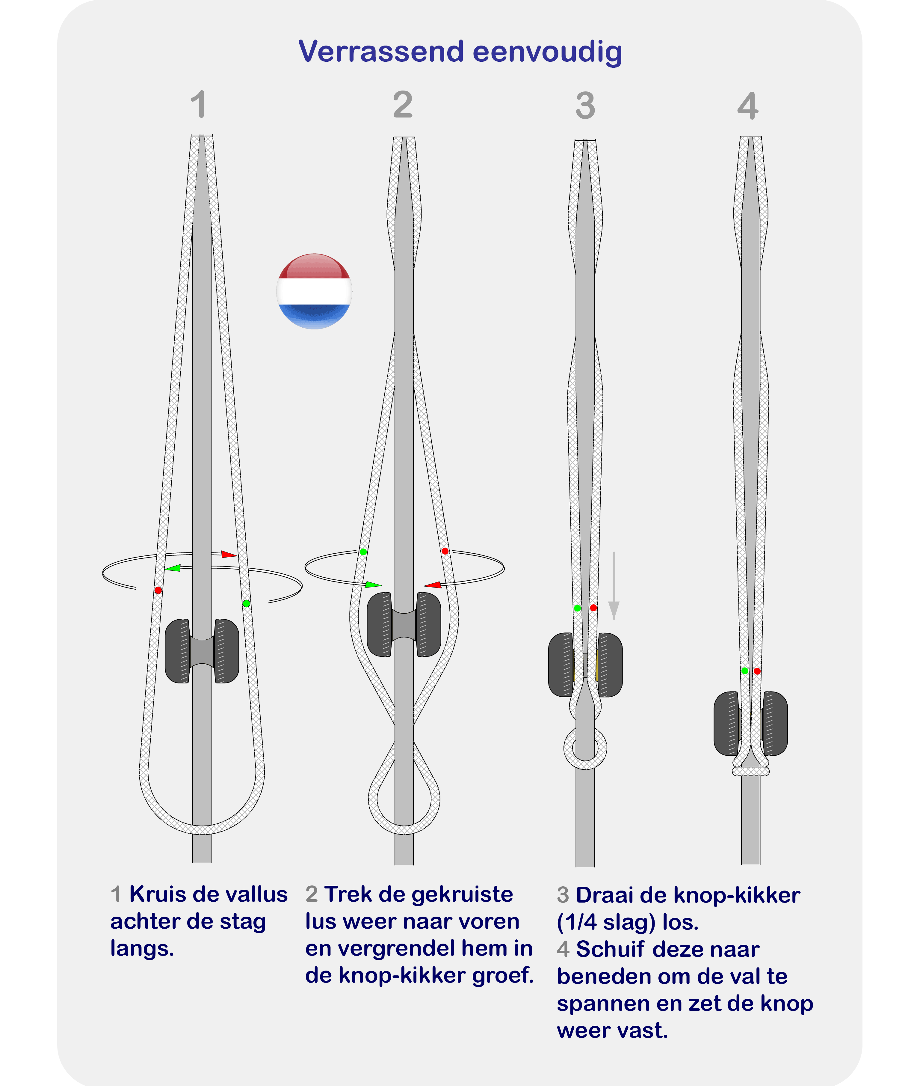 DE STAGKIKKER MONTEREN ![]() ![]() Tips. Oefen de montage van de knop-kikker eerst boven een tafel. Leg een handdoek op dek tijdens de montage aan de stag. Zo verklein je de kans dat wanneer er per ongeluk iets valt, het op dek stuitert en overboord valt. Neem je tijd, je hoeft het maar één keer te doen. Val bevestigen en spannen ![]() Het maakt niet uit hoeveel vlaggen je hijst, de verstelbare knop-kikker volgt de wisselende lengte van de val. BEPAAL DE LENGTE VAN DE VLAGGENVAL – Maak een halve steek op het (achterste) onderwant. Zodanig dat de val wordt gecentreerd tussende de mast en het hoofdwant (zie afbeelding). – Zo voorkom je dat de vlag voortdurend het hoofdwant of de mast raakt, hetgeen onnodige slijtage en vooral in de kajuit een hinderlijk geluid veroorzaakt. ![]() – Plaats de knop-kikker (stagkikker) niet hoger dan 20cm. onder de halve steek. – Pas ten slotte de val-lengte (zonder vlag) aan zodat hij, zoals hierboven beschreven, rond de knop-kikker past. Gebruik 3 mm (1/8”) gevlochten polyester vlaggenlijn. Onderhoud: Afspoelen met zoet water. ![]() De kleine slimme stagkikker. |
